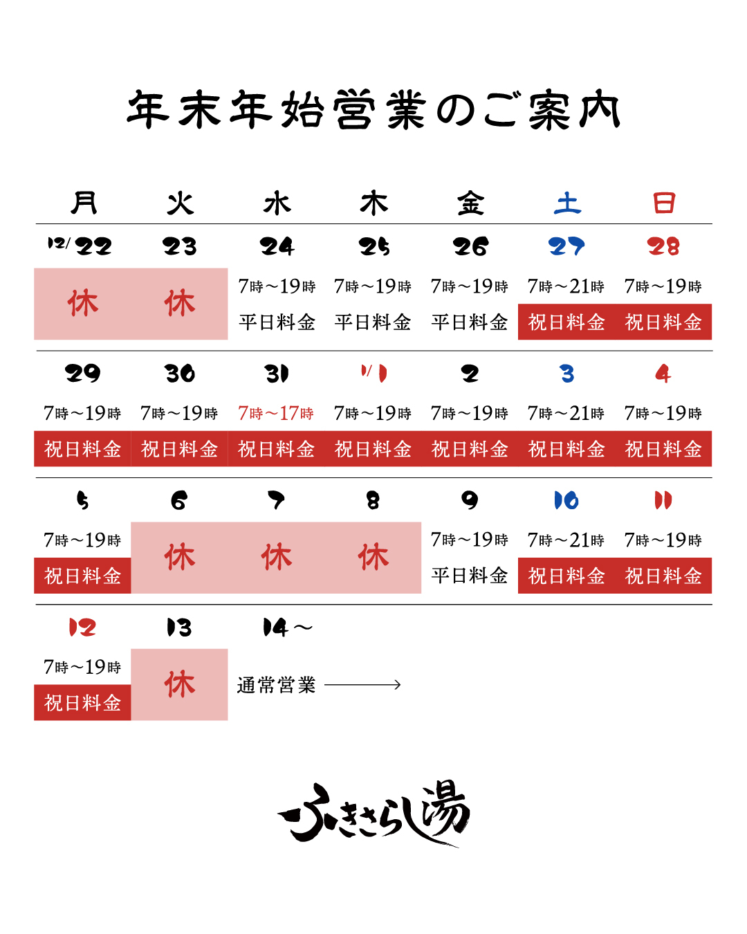 ふきさらし湯では、年末年始の営業日が決定いたしました。