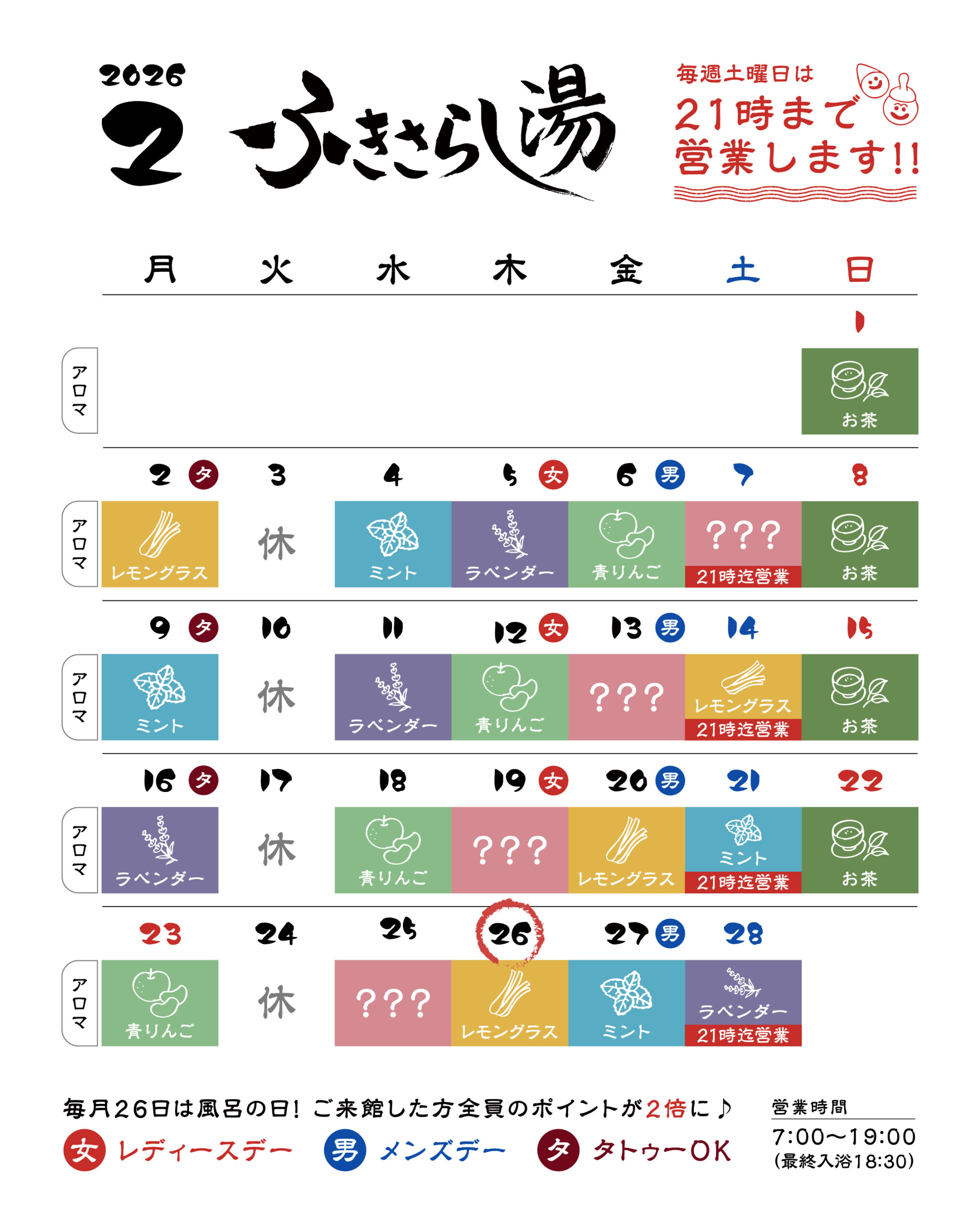 いつもふきさらし湯をご利用いただき、誠にありがとうございます。2月の営業スケジュールをお知らせいたします。皆さまのご来館をスタッフ一同、心よりお待ちしております。