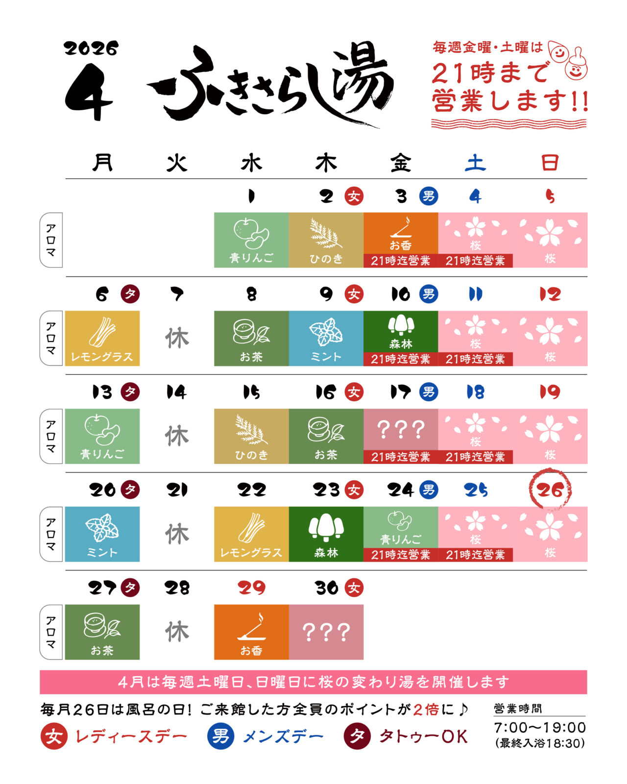 いつもふきさらし湯をご利用いただき、誠にありがとうございます。4月の営業スケジュールをお知らせいたします。皆さまのご来館をスタッフ一同、心よりお待ちしております。