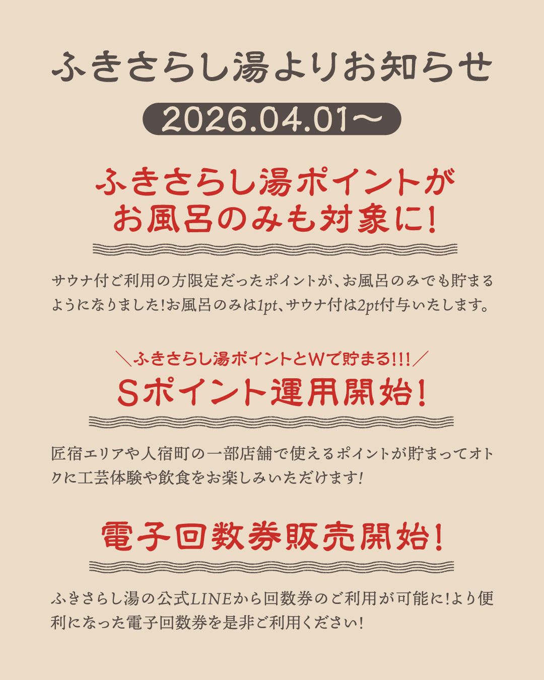 2026年4月1日から、「ふきさらし湯ポイント」と「Sポイント」の両方が貯まります!