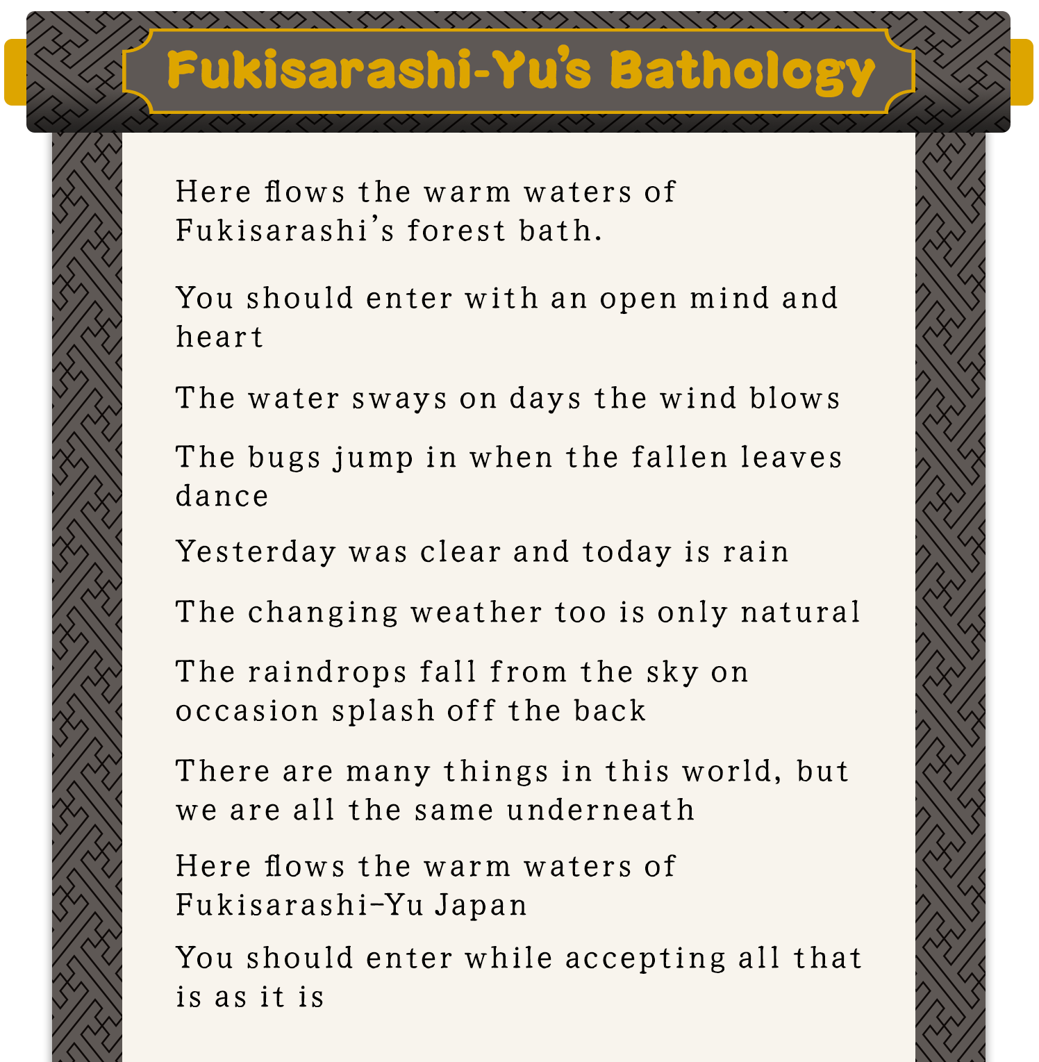 Hard water, rich in calcium and magnesium ions, can leave skin dry and fabrics stiff. At Fukisarashi-Yu, our baths are luxuriously filled with water purified through a state-of-the-art filtration system that reduces hardness to nearly zero.